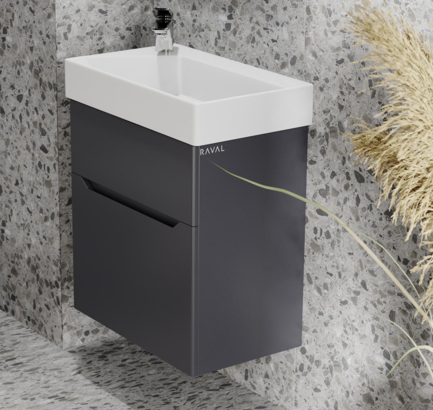 Удобное решение для организации пространства под раковиной! Подвесная тумба Raval Brik 55 выполнена в стильной и практичной цветовой гамме антрацит.