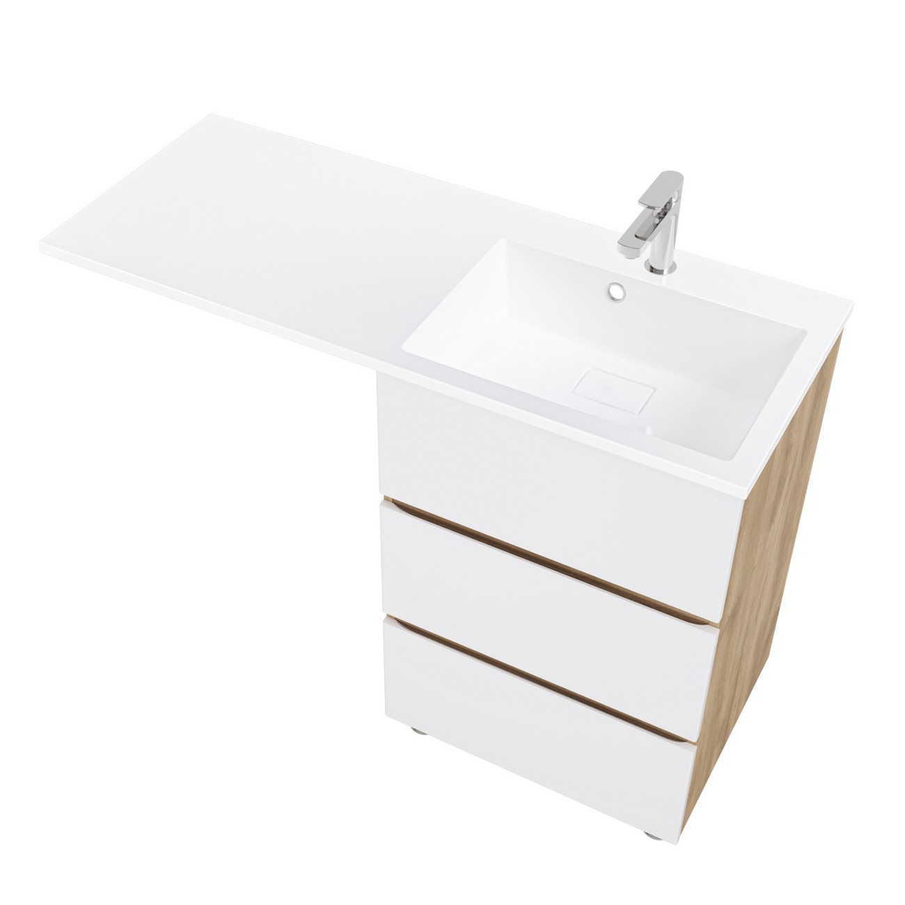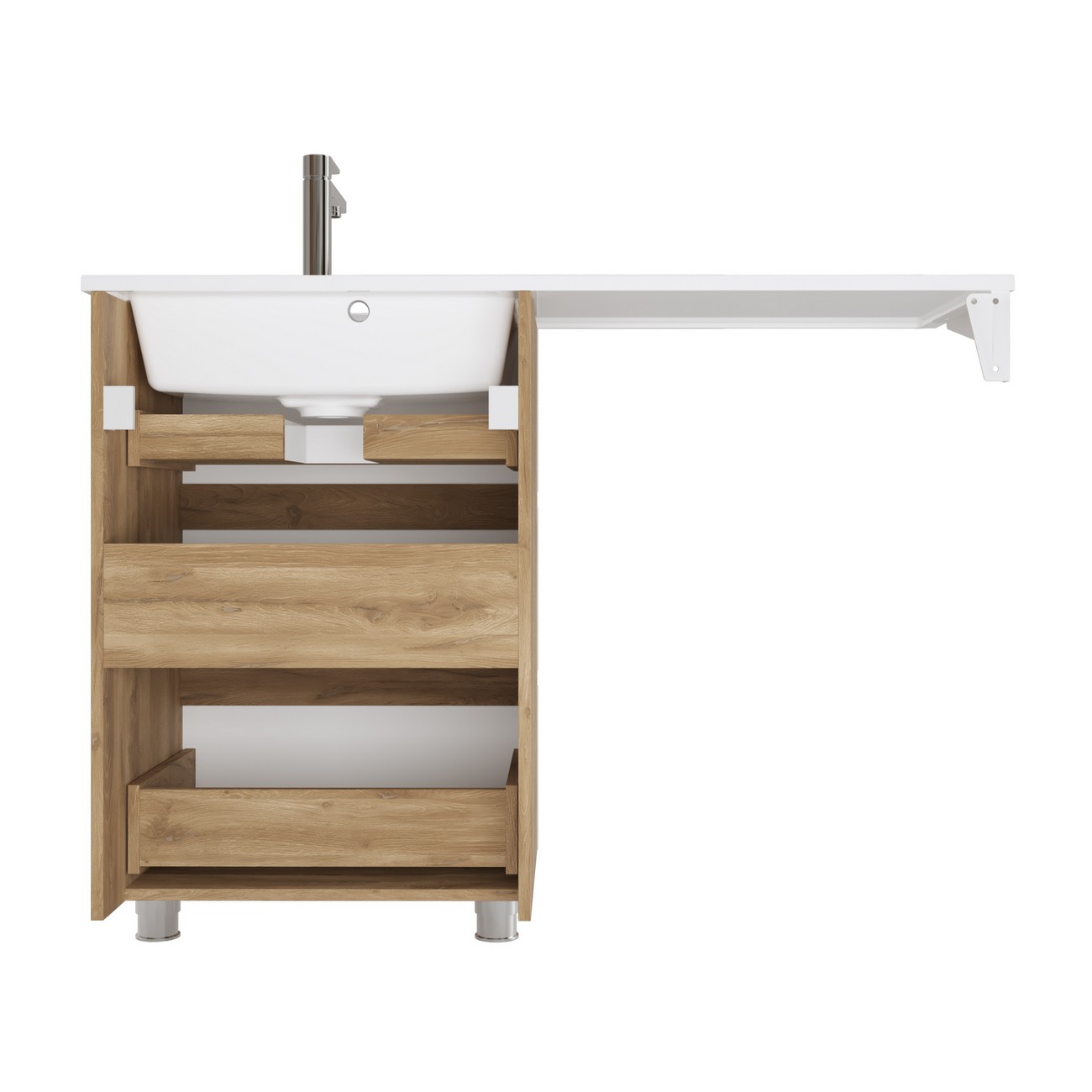 - Материал изготовления обеспечивает прочность и долговечность изделия, делая тумбу надежной основой для хранения необходимых вещей в ванной комнате;