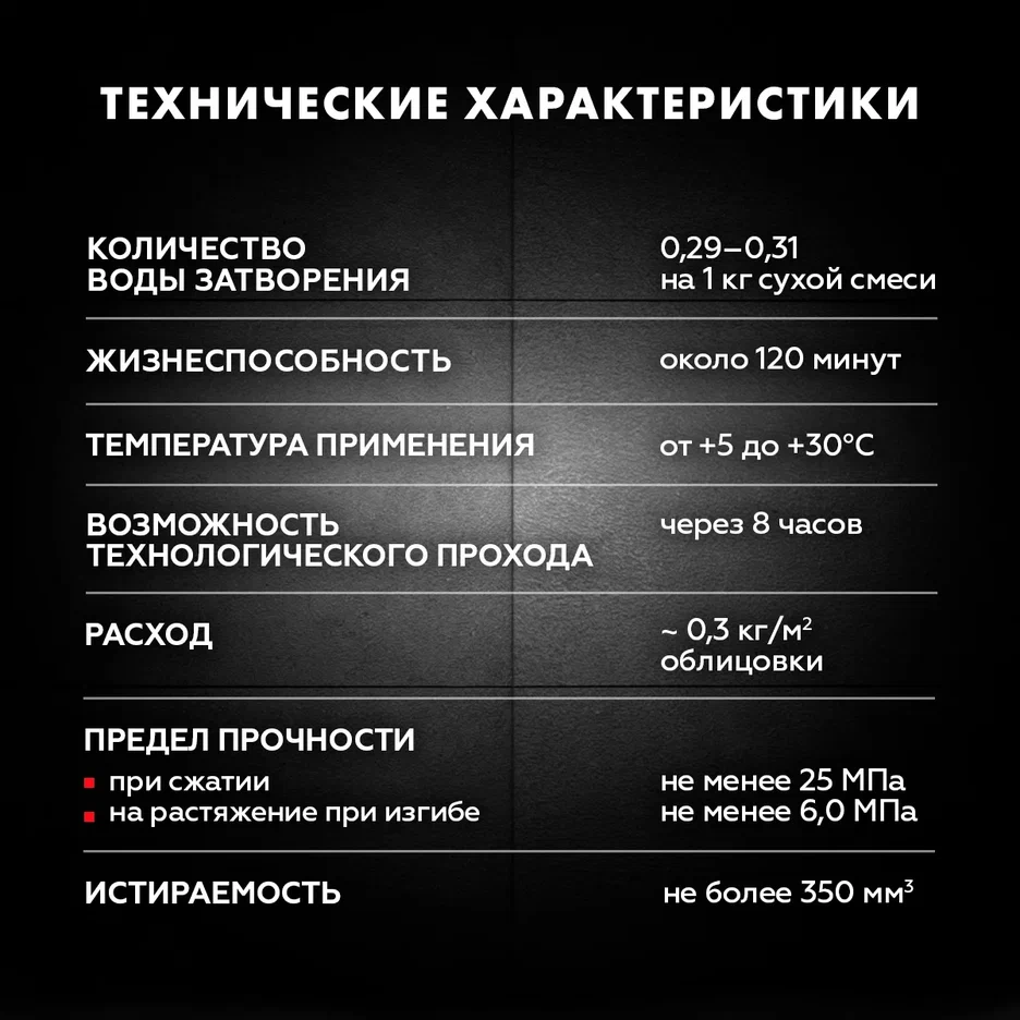 - Особенности состава: водоотталкивающие свойства, повышенная прочность сцепления